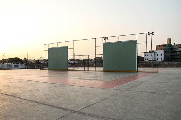 La cancha, está constituida por una pared vertical denominada “frontis” de 5 metros de alto por 6 de ancho; el piso está delimitado por líneas que forman un rectángulo de 7.6 metros de ancho por 12 metros de largo.